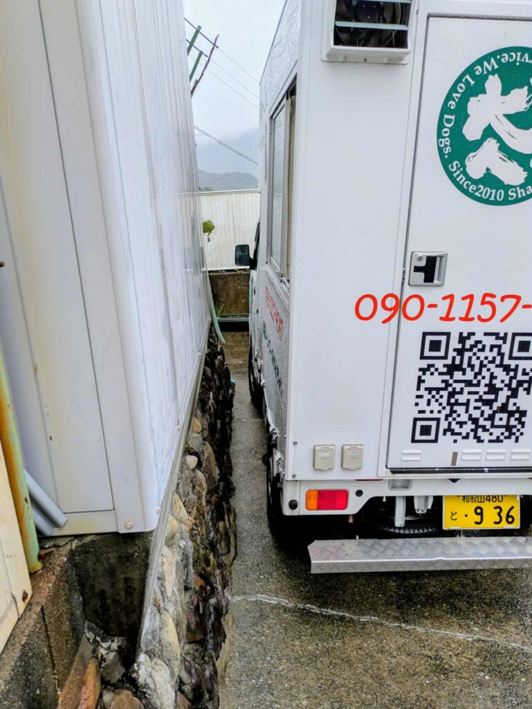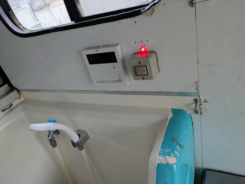 わんちゅ号の水ポンプはベース車のバッテリーの12Vで駆動しています、これがコンセント差してなくても水が使えるのでめっちゃ便利!お弁当食べるまえに手を洗ったり食後の歯磨きもできちゃうし(笑)だけど切り忘れてひと晩おいたので完全にバッテリーがあがってしもうた。