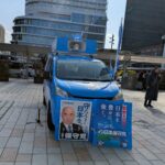 図らずも鹿児島中央駅前にて、『日本保守党』の街宣車を発見!飛行機まで時間が無いのが残念、候補の森けんたろうさんと握手と激励のみさせていただけた。がんばれ!がんばろう。