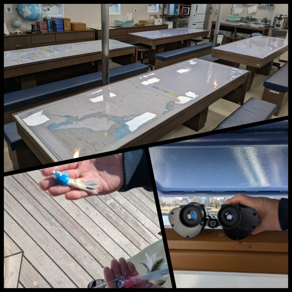 生徒たちの食堂、一本釣りの疑似餌、鳥山ウォッチのためのひさしと双眼鏡(カツオに追われて水面に浮く小魚を狙う鳥の群れを探す)
