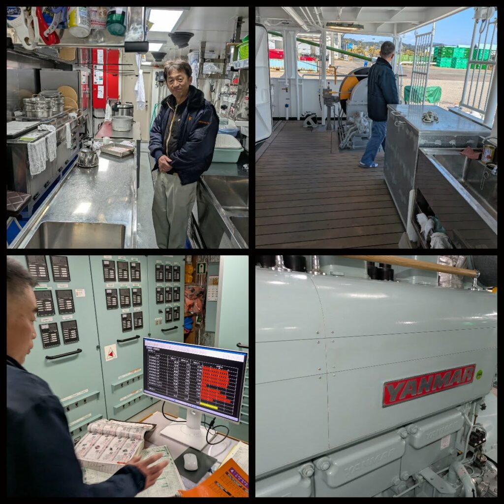 機関長のMさん、司厨長(しちゅうちょう)のTさんの仕事場を見せていただいた。機関長って・・もしかして船のナンバー2?? 司厨長って長い航海で水産高校の生徒50人とクルーの心身の健康を守るめっちゃ大事な仕事を任されたかた。。